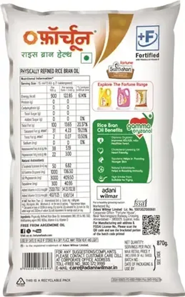 FORTUNE health physically refined Rice Bran Oil Pouch (870 g)